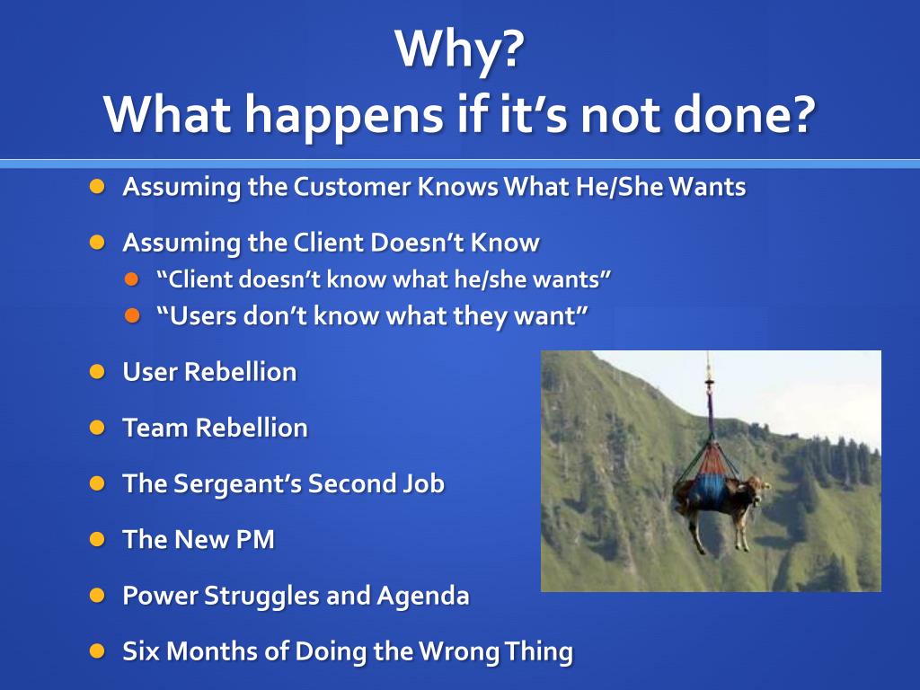 Why? What happens if it’s not done? • Assuming the Customer Knows What He/She Wants • Assuming the Client Doesn’t Know • “Client doesn’t know what he/she wants” • “Users don’t know what they want” • User Rebellion • Team Rebellion • The Sergeant’s Second Job • The New PM • Power Struggles and Agenda • Six Months of Doing the Wrong Thing