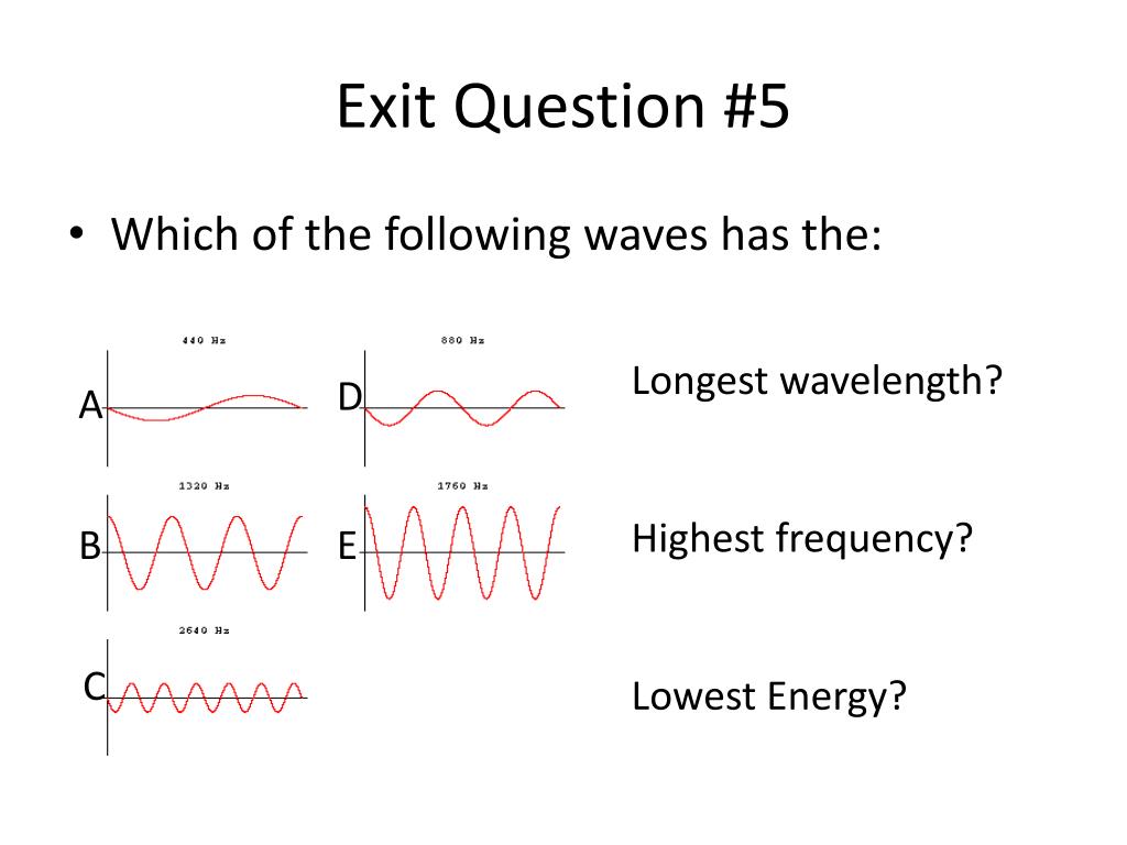 Exit Question #5 • Which of the following waves has the: Longest wavelength? Highest frequency? Lowest Energy? D A B E C