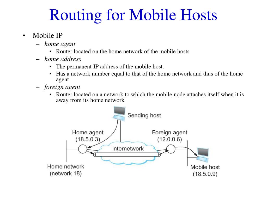 Routing for Mobile Hosts • Mobile IP • home agent • Router located on the home network of the mobile hosts • home address • The permanent IP address of the mobile host. • Has a network number equal to that of the home network and thus of the home agent • foreign agent • Router located on a network to which the mobile node attaches itself when it is away from its home network