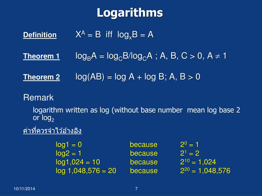 Logarithms DefinitionXA = B ifflogxB = A Theorem 1logBA = logCB/logCA ; A, B, C > 0, A 1 Theorem 2log(AB) = log A + log B; A, B > 0 Remark logarithm written as log (without base number mean log base2 or log2 ค่าที่ควรจำไว้อ้างอิง log1 = 0 because 20 = 1 log2 = 1 because 21 = 2 log1,024 = 10 because 210 = 1,024 log 1,048,576 = 20 because 220 = 1,048,576