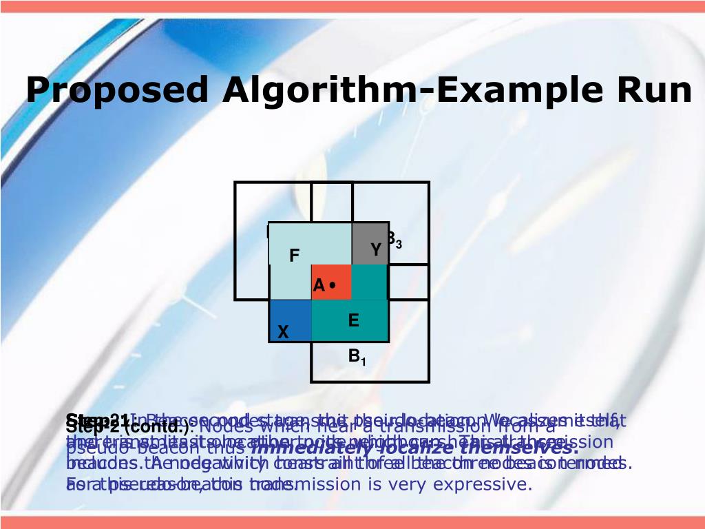 B2 B3 F A X B1 Proposed Algorithm-Example Run Y E Step-1: Beacon nodes transmit their location. We assume that there is at least one other node which can hear all three beacons. A node which hears all three beacon nodes is termed as a pseudo-beacon node. Step-2: In the second stage, the pseudo-beacon localizes itself, and transmits its location to its neighbours. This transmission includes the negativity constraint of all the three beacon nodes. For this reason, this transmission is very expressive. Step-2 (contd.): Nodes which hear a transmission from a pseudo-beacon thus immediately localize themselves.