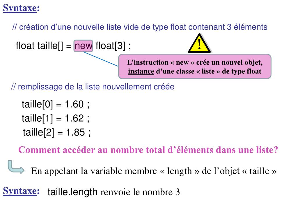 Syntaxe: // création d’une nouvelle liste vide de type float contenant 3 éléments float taille[] = new float[3] ; L’instruction « new » crée un nouvel objet, instance d’une classe « liste » de type float // remplissage de la liste nouvellement créée taille[0] = 1.60 ; taille[1] = 1.62 ; taille[2] = 1.85 ; Comment accéder au nombre total d’éléments dans une liste? En appelant la variable membre « length » de l’objet « taille » Syntaxe: taille.lengthrenvoie le nombre 3