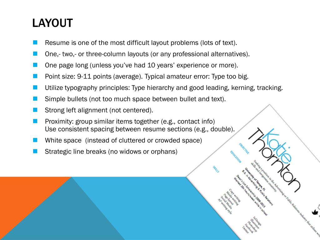 Layout • nResume is one of the most difficult layout problems (lots of text). • nOne,- two,- or three-column layouts (or any professional alternatives). • nOne page long (unless you’ve had 10 years’ experience or more). • nPoint size: 9-11 points (average). Typical amateur error: Type too big. • nUtilize typography principles: Type hierarchy and good leading, kerning, tracking. • nSimple bullets (not too much space between bullet and text). • nStrong left alignment (not centered). • nProximity: group similar items together (e.g., contact info) Use consistent spacing between resume sections (e.g., double). • nWhite space (instead of cluttered or crowded space) • nStrategic line breaks (no widows or orphans)