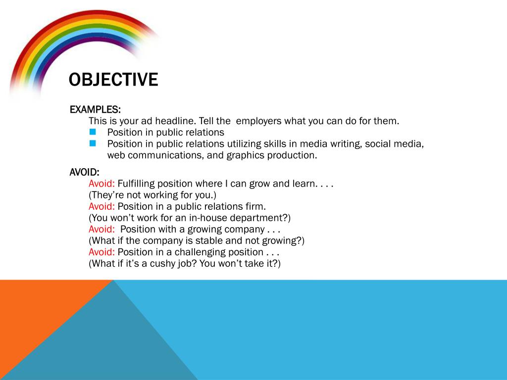 OBJECTIVE • EXAMPLES:This is your ad headline. Tell the employers what you can do for them.nPosition in public relationsnPosition in public relations utilizing skills in media writing, social media, web communications, and graphics production. • AVOID:Avoid: Fulfilling position where I can grow and learn. . . . (They’re not working for you.) Avoid: Position in a public relations firm. (You won’t work for an in-house department?)Avoid: Position with a growing company . . . (What if the company is stable and not growing?)Avoid: Position in a challenging position . . . (What if it’s a cushy job? You won’t take it?)