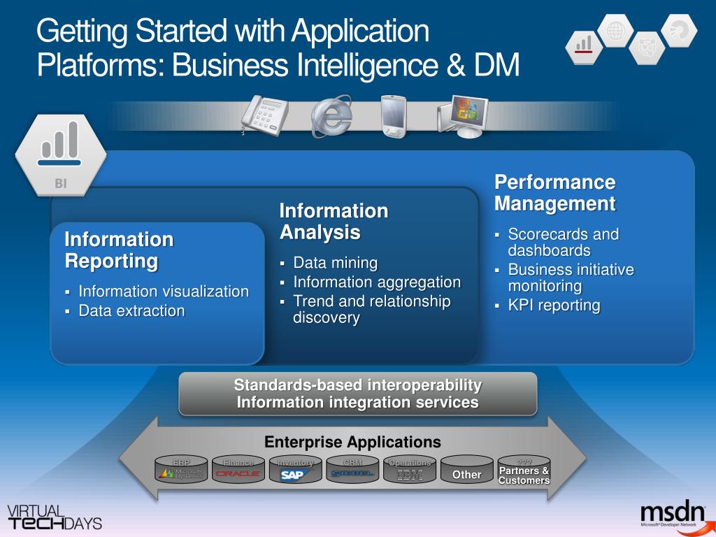 Information Reporting Information Analysis Performance Management Standard Web Rich Media Web Social Computing The Microsoft Application PlatformAn integrated, unified platform for multiple applications Service Enablement Connectivity Composite Applications ERP Finance Inventory CRM Operations Other Partners & Customers ??? Enterprise Applications
