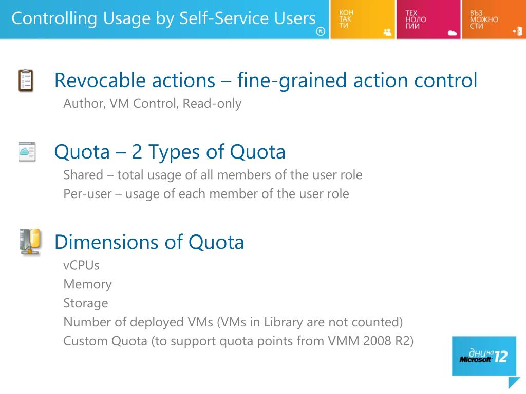 Controlling Usage by Self-Service Users • Revocable actions – fine-grained action control Author, VM Control, Read-only • Quota – 2 Types of Quota Shared – total usage of all members of the user role Per-user – usage of each member of the user role • Dimensions of Quota vCPUs Memory Storage Number of deployed VMs (VMs in Library are not counted) Custom Quota (to support quota points from VMM 2008 R2)