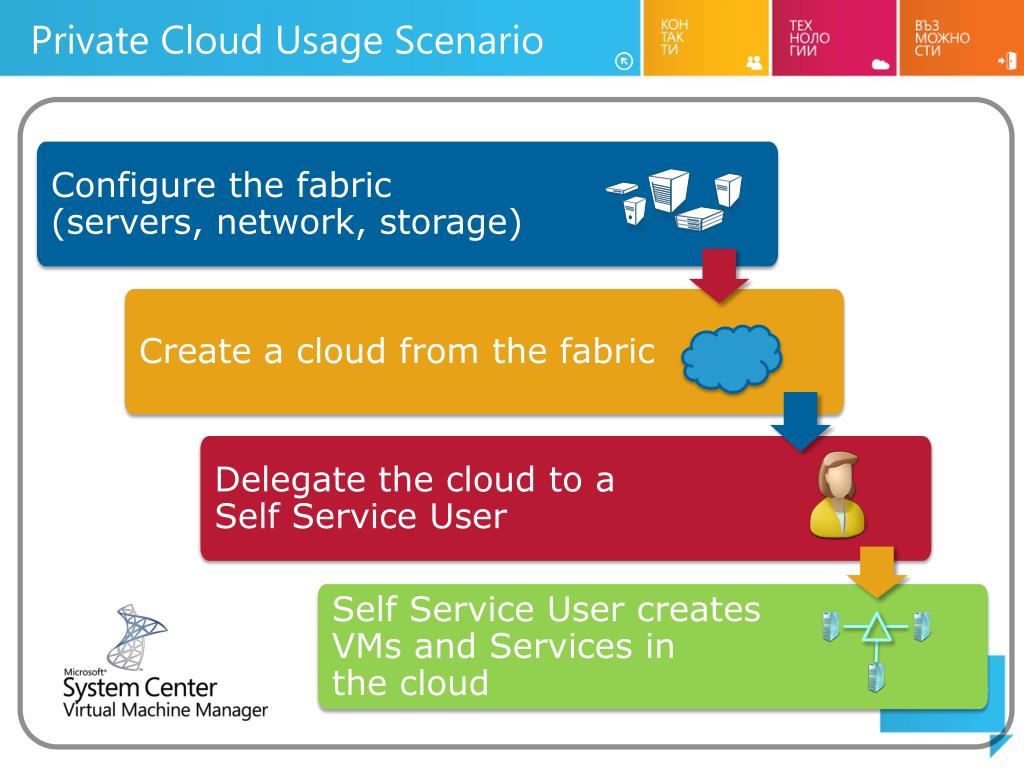 Delivering the private cloudInfrastructurewith SC VMM 2012 Self Service “Administration” Business Empowerment SLA Management APP 1 OS APP 2 APP 3 Externally Configure Sales HR Marketing Finance Delegated Clouds Logical & Standardized Diverse Infrastructure Source: Tech-ed North America 2011