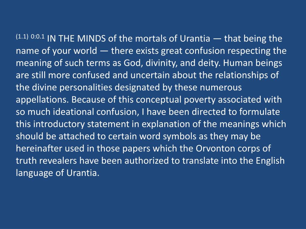 (1.1)0:0.1 IN THE MINDS of the mortals of Urantia — that being the name of your world — there exists great confusion respecting the meaning of such terms as God, divinity, and deity. Human beings are still more confused and uncertain about the relationships of the divine personalities designated by these numerous appellations. Because of this conceptual poverty associated with so much ideational confusion, I have been directed to formulate this introductory statement in explanation of the meanings which should be attached to certain word symbols as they may be hereinafter used in those papers which the Orvonton corps of truth revealers have been authorized to translate into the English language of Urantia.