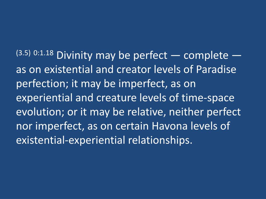 (3.5)0:1.18 Divinity may be perfect — complete — as on existential and creator levels of Paradise perfection; it may be imperfect, as on experiential and creature levels of time-space evolution; or it may be relative, neither perfect nor imperfect, as on certain Havona levels of existential-experiential relationships.