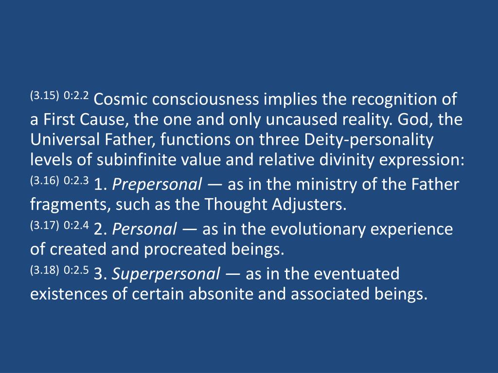 (3.15)0:2.2 Cosmic consciousness implies the recognition of a First Cause, the one and only uncaused reality. God, the Universal Father, functions on three Deity-personality levels of subinfinite value and relative divinity expression: (3.16)0:2.3 1. Prepersonal — as in the ministry of the Father fragments, such as the Thought Adjusters. (3.17)0:2.4 2. Personal — as in the evolutionary experience of created and procreated beings. (3.18)0:2.5 3. Superpersonal — as in the eventuated existences of certain absonite and associated beings.
