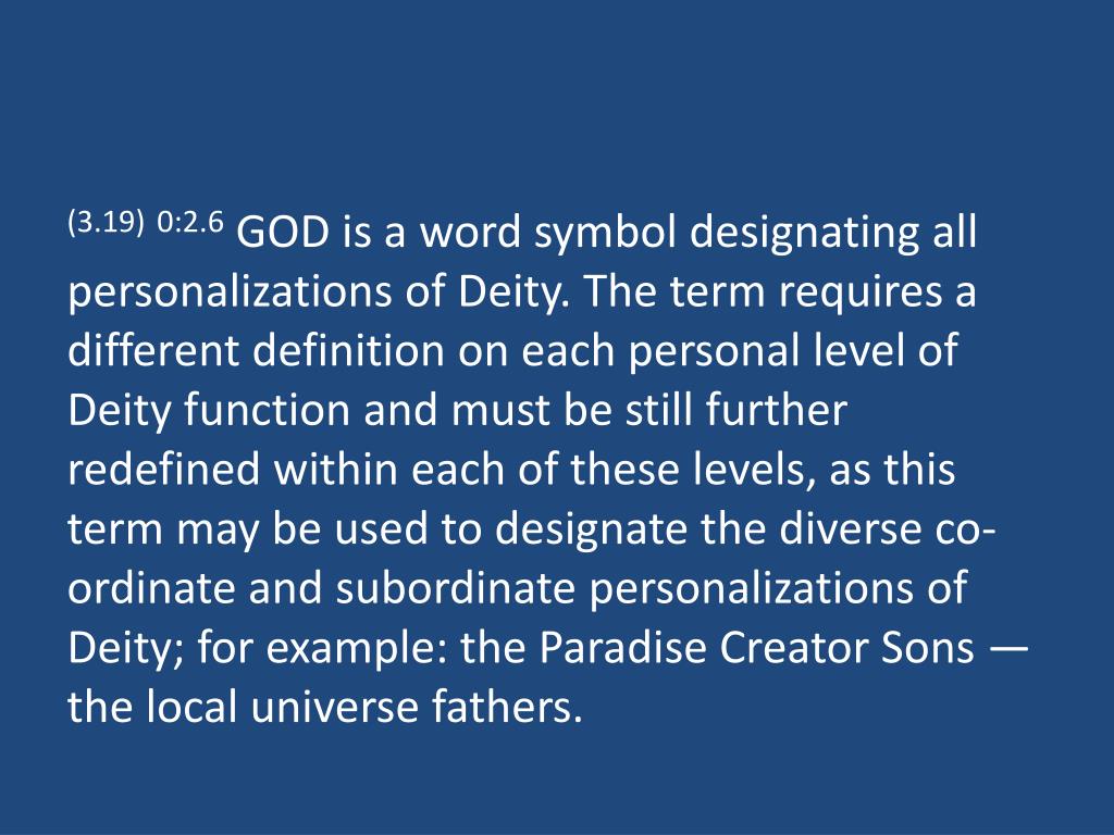 (3.19)0:2.6 GOD is a word symbol designating all personalizations of Deity. The term requires a different definition on each personal level of Deity function and must be still further redefined within each of these levels, as this term may be used to designate the diverse co-ordinate and subordinate personalizations of Deity; for example: the Paradise Creator Sons — the local universe fathers.