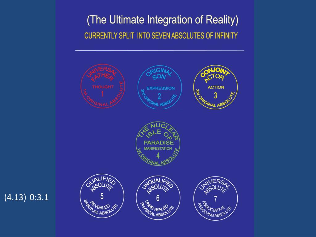 III. The First Source and Center (4.13)0:3.1 Total, infinite reality is existential in seven phases and as seven co-ordinate Absolutes: (5.1)0:3.2 1. The First Source and Center. (5.2)0:3.3 2. The Second Source and Center. (5.3)0:3.4 3. The Third Source and Center. (5.4)0:3.5 4. The Isle of Paradise. (5.5)0:3.6 5. The Deity Absolute. (5.6)0:3.7 6. The Universal Absolute. (5.7)0:3.8 7. The Unqualified Absolute.