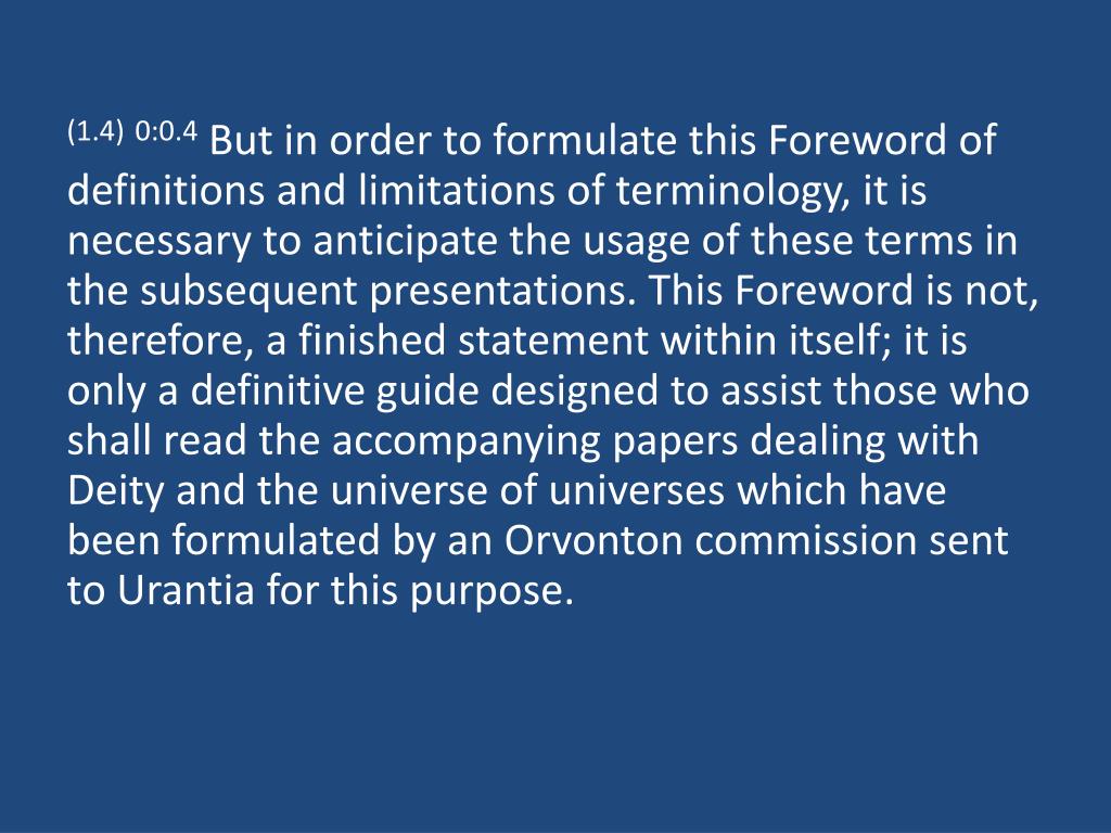 (1.4)0:0.4 But in order to formulate this Foreword of definitions and limitations of terminology, it is necessary to anticipate the usage of these terms in the subsequent presentations. This Foreword is not, therefore, a finished statement within itself; it is only a definitive guide designed to assist those who shall read the accompanying papers dealing with Deity and the universe of universes which have been formulated by an Orvonton commission sent to Urantia for this purpose.