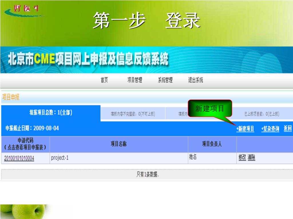 项目申报系统使用培训. 好医生医学教育中心. 项目申报系统使用培训. 北京市级项目申报使用 国家级项目申报使用. 项目申报 项目执行情况填写 项目备案 查询已上报项目. 北京市级项目申报系统组成部分. 项目申报 项目执行情况填写 项目备案 查询已上报项目. 北京项目申报系统. 将项目上报给上级行政管理用户. 7. 6. 3. 2. 5. 4. 1. 登录. 项目其他信息. 多期举办信息. 项目上报. 项目基本信息. 项目负责人信息. 课程及教师信息. 项目申报流程. 第一步 登录. 第一步 登录. 项目申报.