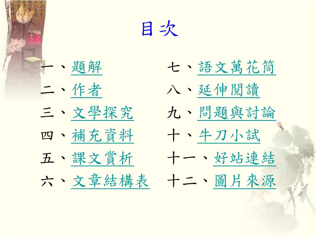 目次 一、題解 七、語文萬花筒 二、作者 八、延伸閱讀 三、文學探究 九、問題與討論 四、補充資料 十、牛刀小試 五、課文賞析 十一、好站連結 六、文章結構表 十二、圖片來源