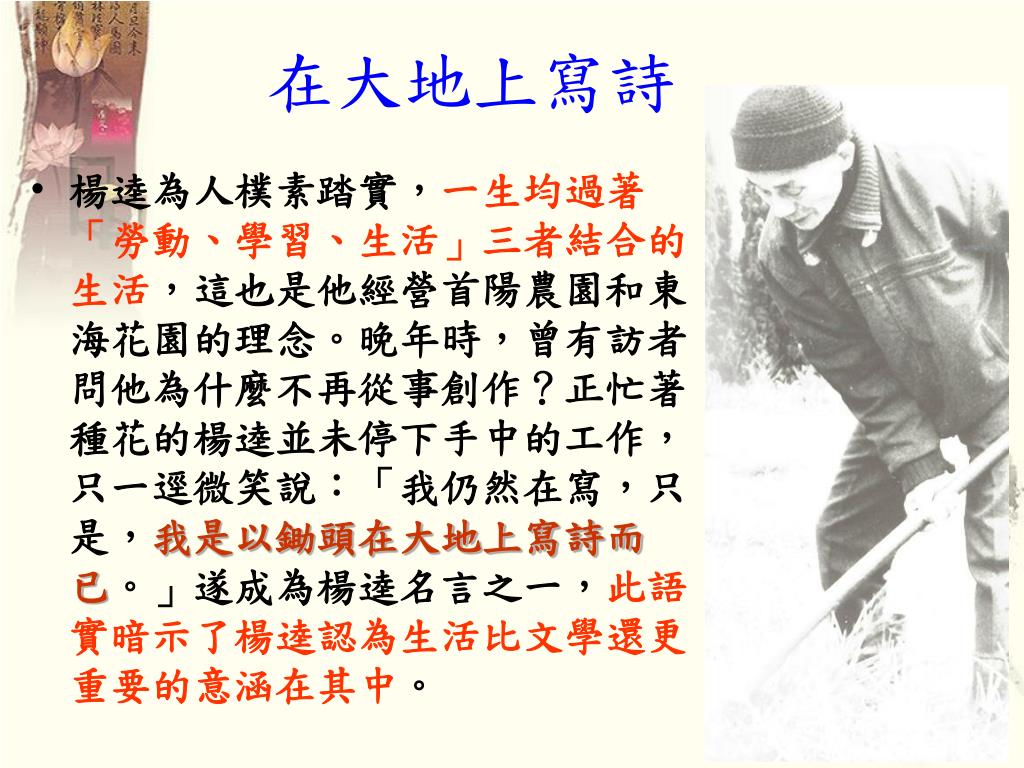 在大地上寫詩 • 楊逵為人樸素踏實,一生均過著「勞動、學習、生活」三者結合的生活,這也是他經營首陽農園和東海花園的理念。晚年時,曾有訪者問他為什麼不再從事創作?正忙著種花的楊逵並未停下手中的工作,只一逕微笑說:「我仍然在寫,只是,我是以鋤頭在大地上寫詩而已。」遂成為楊逵名言之一,此語實暗示了楊逵認為生活比文學還更重要的意涵在其中。