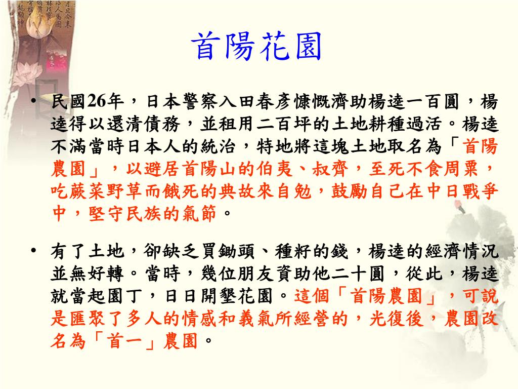 首陽花園 • 民國26年,日本警察入田春彥慷慨濟助楊逵一百圓,楊逵得以還清債務,並租用二百坪的土地耕種過活。楊逵不滿當時日本人的統治,特地將這塊土地取名為「首陽農園」,以避居首陽山的伯夷、叔齊,至死不食周粟,吃蕨菜野草而餓死的典故來自勉,鼓勵自己在中日戰爭中,堅守民族的氣節。 • 有了土地,卻缺乏買鋤頭、種籽的錢,楊逵的經濟情況並無好轉。當時,幾位朋友資助他二十圓,從此,楊逵就當起園丁,日日開墾花園。這個「首陽農園」,可說是匯聚了多人的情感和義氣所經營的,光復後,農園改名為「首一」農園。