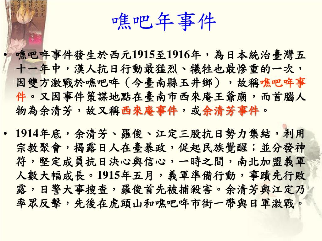 噍吧年事件 • 噍吧哖事件發生於西元1915至1916年,為日本統治臺灣五十一年中,漢人抗日行動最猛烈、犧牲也最慘重的一次,因雙方激戰於噍吧哖(今臺南縣玉井鄉),故稱噍吧哖事件。又因事件策謀地點在臺南市西來庵王爺廟,而首腦人物為余清芳,故又稱西來庵事件,或余清芳事件。 • 1914年底,余清芳、羅俊、江定三股抗日勢力集結,利用宗教聚會,揭露日人在臺暴政,促起民族覺醒;並分發神符,堅定成員抗日決心與信心,一時之間,南北加盟義軍人數大幅成長。1915年五月,義軍準備行動,事蹟先行敗露,日警大事搜查,羅俊首先被捕殺害。余清芳與江定乃率眾反擊,先後在虎頭山和噍吧哖市街一帶與日軍激戰。