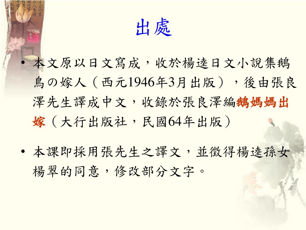 出處 • 本文原以日文寫成,收於楊逵日文小說集鵝鳥の嫁人(西元1946年3月出版),後由張良澤先生譯成中文,收錄於張良澤編鵝媽媽出嫁(大行出版社,民國64年出版) • 本課即採用張先生之譯文,並徵得楊逵孫女楊翠的同意,修改部分文字。