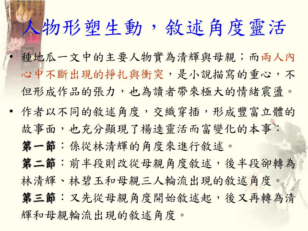 人物形塑生動,敘述角度靈活 • 種地瓜一文中的主要人物實為清輝與母親;而兩人內心中不斷出現的掙扎與衝突,是小說描寫的重心,不但形成作品的張力,也為讀者帶來極大的情緒震盪。 • 作者以不同的敘述角度,交織穿插,形成豐富立體的故事面,也充分顯現了楊逵靈活而富變化的本事:第一節:係從林清輝的角度來進行敘述。第二節:前半段則改從母親角度敘述,後半段卻轉為林清輝、林碧玉和母親三人輪流出現的敘述角度。第三節:又先從母親角度開始敘述起,後又再轉為清輝和母親輪流出現的敘述角度。