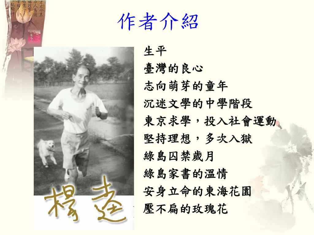 作者介紹 生平 臺灣的良心 志向萌芽的童年 沉迷文學的中學階段 東京求學,投入社會運動 堅持理想,多次入獄 綠島囚禁歲月 綠島家書的溫情 安身立命的東海花園 壓不扁的玫瑰花
