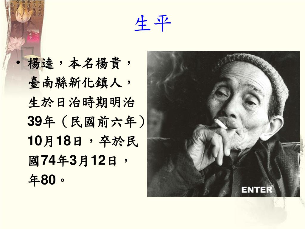 生平 • 楊逵,本名楊貴,臺南縣新化鎮人,生於日治時期明治39年(民國前六年)10月18日,卒於民國74年3月12日,年80。