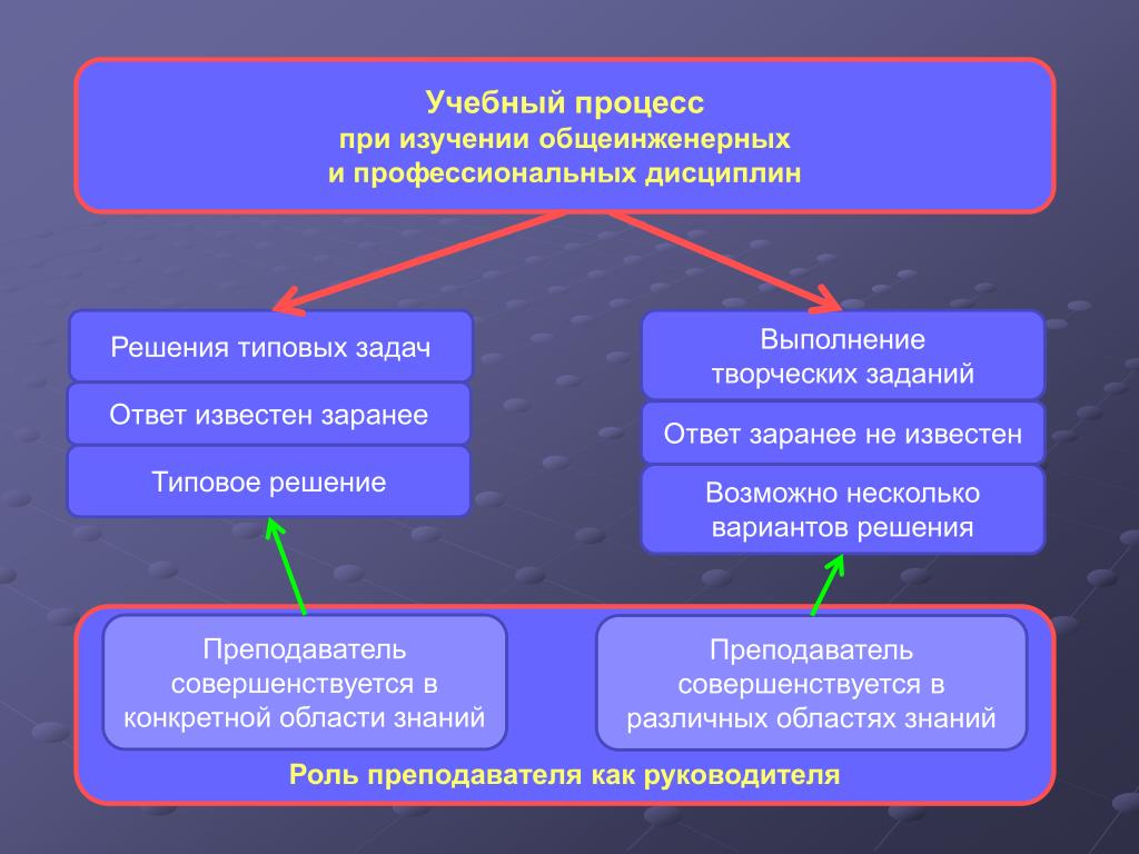 Учебный процесс при изучении общеинженерных и профессиональных дисциплин Решения типовых задач Выполнение творческих заданий Ответ известен заранее Ответ заранее не известен Типовое решение Возможно несколько вариантов решения Роль преподавателя как руководителя Преподаватель совершенствуется в конкретной области знаний Преподаватель совершенствуется в различных областях знаний
