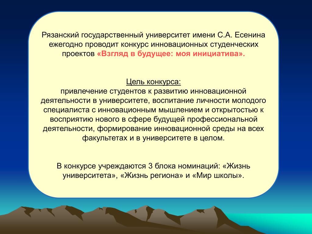 Рязанский государственный университет имени С.А. Есенина ежегодно проводит конкурс инновационных студенческих проектов «Взгляд в будущее: моя инициатива». Цель конкурса: привлечение студентов к развитию инновационной деятельности в университете, воспитание личности молодого специалиста с инновационным мышлением и открытостью к восприятию нового в сфере будущей профессиональной деятельности, формирование инновационной среды на всех факультетах и в университете в целом. В конкурсе учреждаются 3 блока номинаций: «Жизнь университета», «Жизнь региона» и «Мир школы».