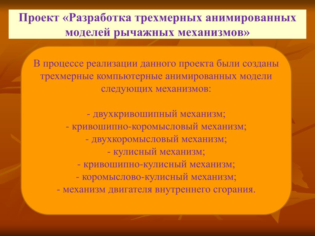 Проект «Разработка трехмерных анимированных моделей рычажных механизмов» В процессе реализации данного проекта были созданы трехмерные компьютерные анимированных модели следующих механизмов: - двухкривошипный механизм; - кривошипно-коромысловый механизм; - двухкоромысловый механизм; - кулисный механизм; - кривошипно-кулисный механизм; - коромыслово-кулисный механизм; - механизм двигателя внутреннего сгорания.
