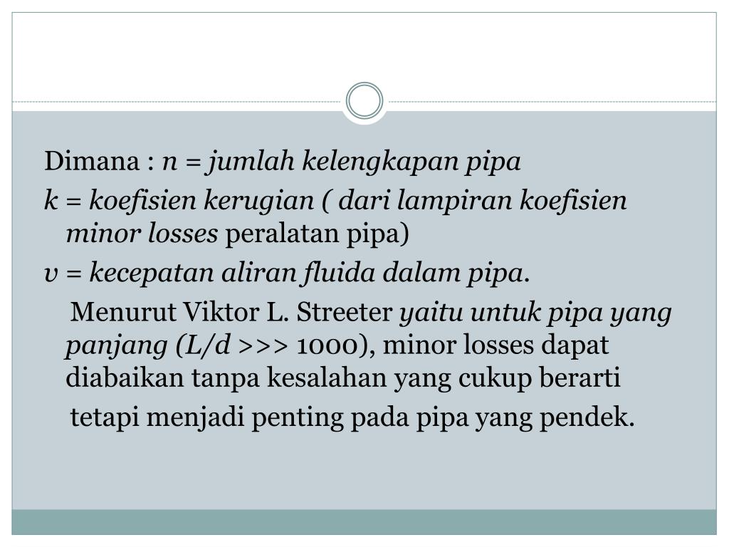 Dimana : n = jumlah kelengkapan pipa k = koefisienkerugian ( darilampirankoefisien minor losses peralatanpipa) v = kecepatan aliran fluida dalam pipa. MenurutViktor L. Streeter yaituuntukpipa yang panjang (L/d >>> 1000), minor losses dapatdiabaikantanpakesalahan yang cukupberarti tetapimenjadipentingpadapipa yang pendek.