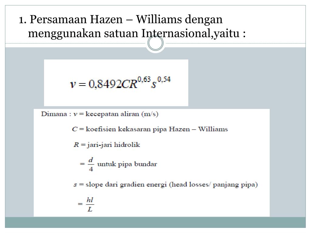 1. Persamaan Hazen – Williams denganmenggunakansatuanInternasional,yaitu :