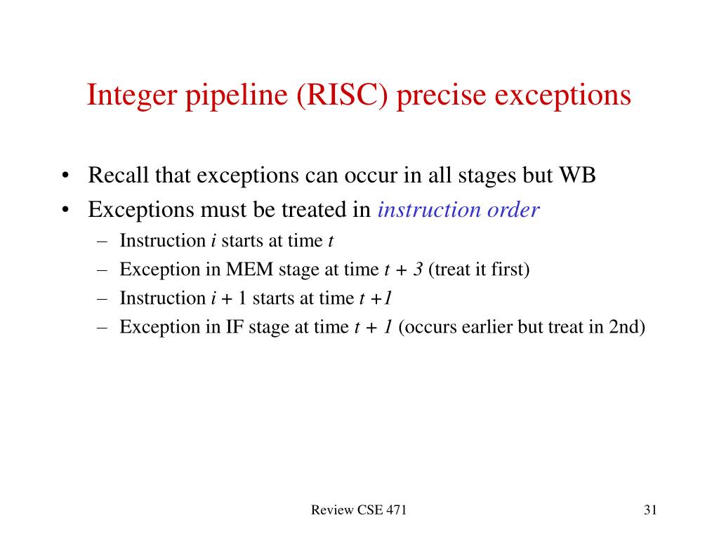 Integer pipeline (RISC) precise exceptions • Recall that exceptions can occur in all stages but WB • Exceptions must be treated in instruction order • Instruction i starts at time t • Exception in MEM stage at time t + 3 (treat it first) • Instruction i + 1 starts at time t +1 • Exception in IF stage at time t + 1 (occurs earlier but treat in 2nd) Review CSE 471