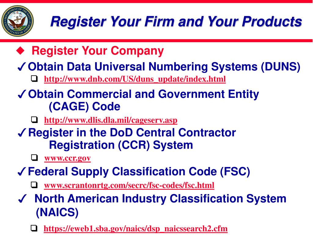 Register Your Firm and Your Products Register Your Company Obtain Data Universal Numbering Systems (DUNS) http://www.dnb.com/US/duns_update/index.html Obtain Commercial and Government Entity (CAGE) Code http://www.dlis.dla.mil/cageserv.asp Register in the DoD Central Contractor Registration (CCR) System www.ccr.gov Federal Supply Classification Code (FSC) www.scrantonrtg.com/secrc/fsc-codes/fsc.html North American Industry Classification System (NAICS) https://eweb1.sba.gov/naics/dsp_naicssearch2.cfm