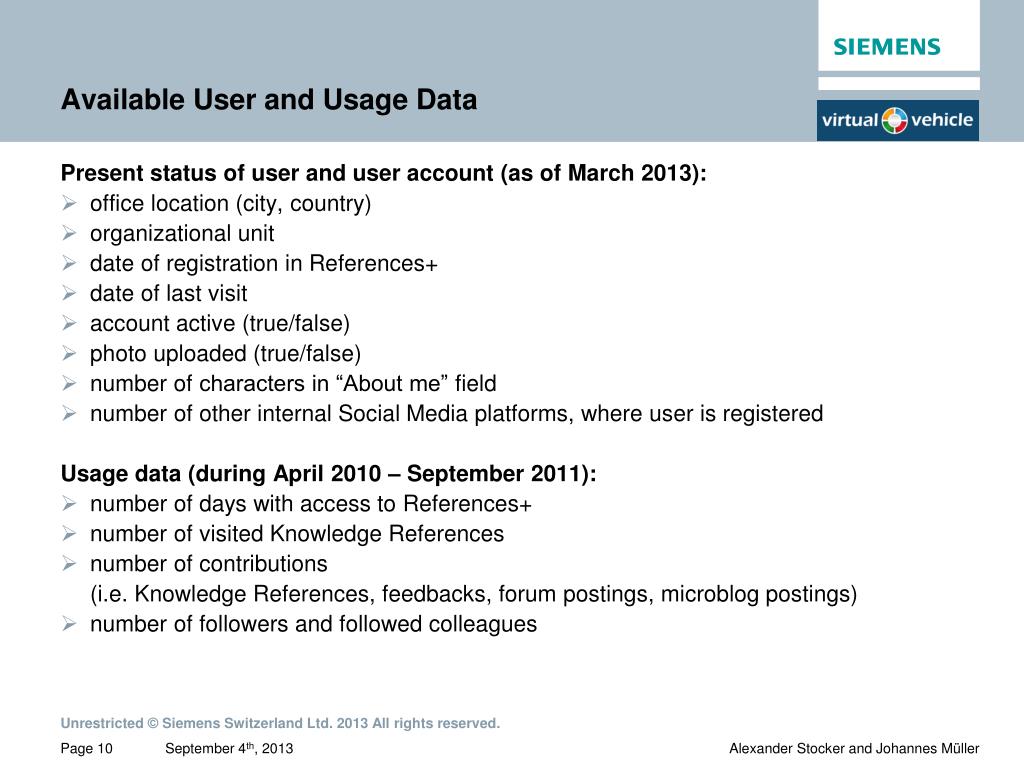 Available User andUsage Data • Present status of user and user account (as of March 2013): • office location (city, country) • organizational unit • date of registration in References+ • date of last visit • account active (true/false) • photo uploaded (true/false) • number of characters in “About me” field • number of other internal Social Media platforms, where user is registered • Usage data (during April 2010 – September 2011): • number of days with access to References+ • numberof visited Knowledge References • numberof contributions(i.e. Knowledge References, feedbacks, forum postings, microblog postings) • numberof followers and followed colleagues