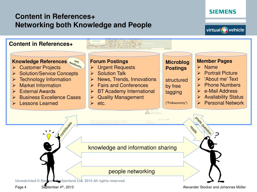 I-KNOW 2013, Graz, Austria, September 4th, 2013 Exploring Factual and Perceived Use and Benefits of aWeb 2.0-based Knowledge Management Application:The Siemens Case References+ Alexander StockerVirtual Vehicle Research CenterInformation & Process Management Graz, Austria Johannes MüllerSiemens Switzerland Ltd.Building Technologies Division Zug, Switzerland