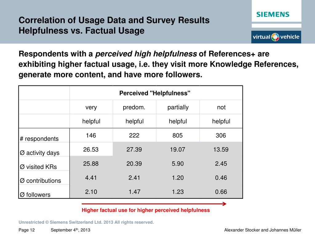 CorrelationofUsage Data and Survey ResultsHelpfulness vs. FactualUsage Perceived "Helpfulness" very predom. partially not helpful helpful helpful helpful 146 222 805 306 # respondents 26.53 27.39 19.07 13.59 Ø activity days 25.88 20.39 5.90 2.45 Ø visited KRs 4.41 2.41 1.20 0.46 Ø contributions 2.10 1.47 1.23 0.66 Ø followers • Respondents with a perceived high helpfulnessof References+ are exhibiting higher factual usage, i.e. they visit more Knowledge References, generate more content, and have more followers. Higher factualuseforhigherperceivedhelpfulness