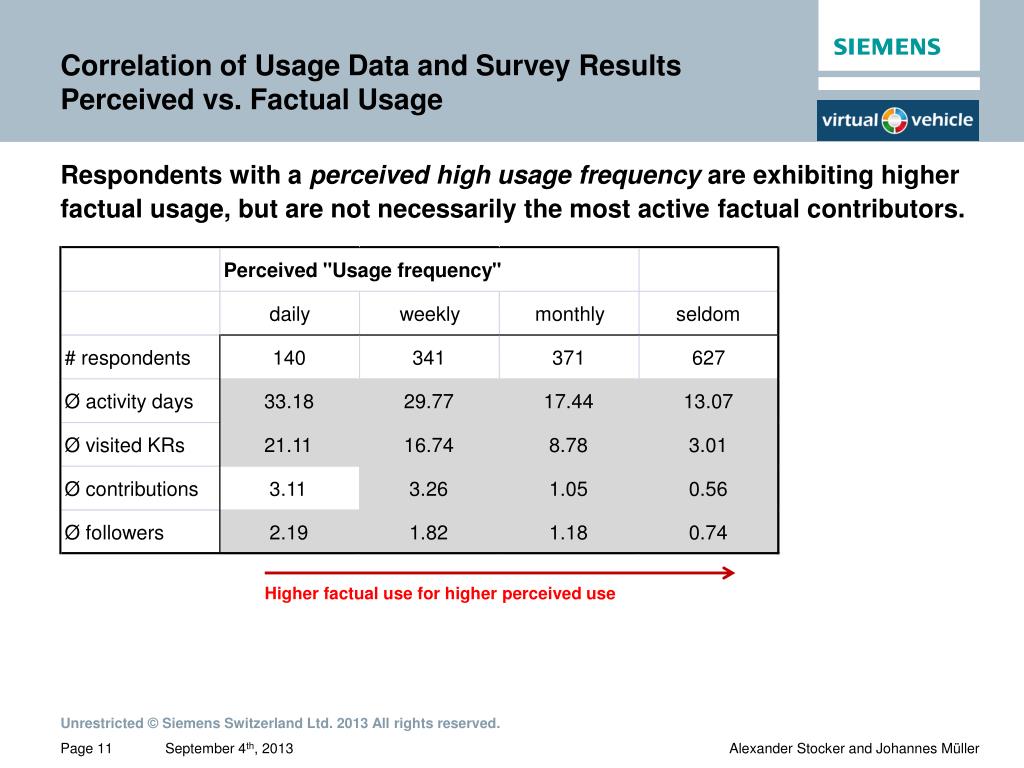 CorrelationofUsage Data and Survey ResultsPerceived vs. FactualUsage Perceived "Usage frequency" daily weekly monthly seldom # respondents 140 341 371 627 Ø activity days 33.18 29.77 17.44 13.07 Ø visited KRs 21.11 16.74 8.78 3.01 Ø contributions 3.11 3.26 1.05 0.56 Ø followers 2.19 1.82 1.18 0.74 • Respondents with a perceived high usage frequency are exhibiting higher factual usage, but are not necessarily the most active factual contributors. Higher factualuseforhigherperceiveduse