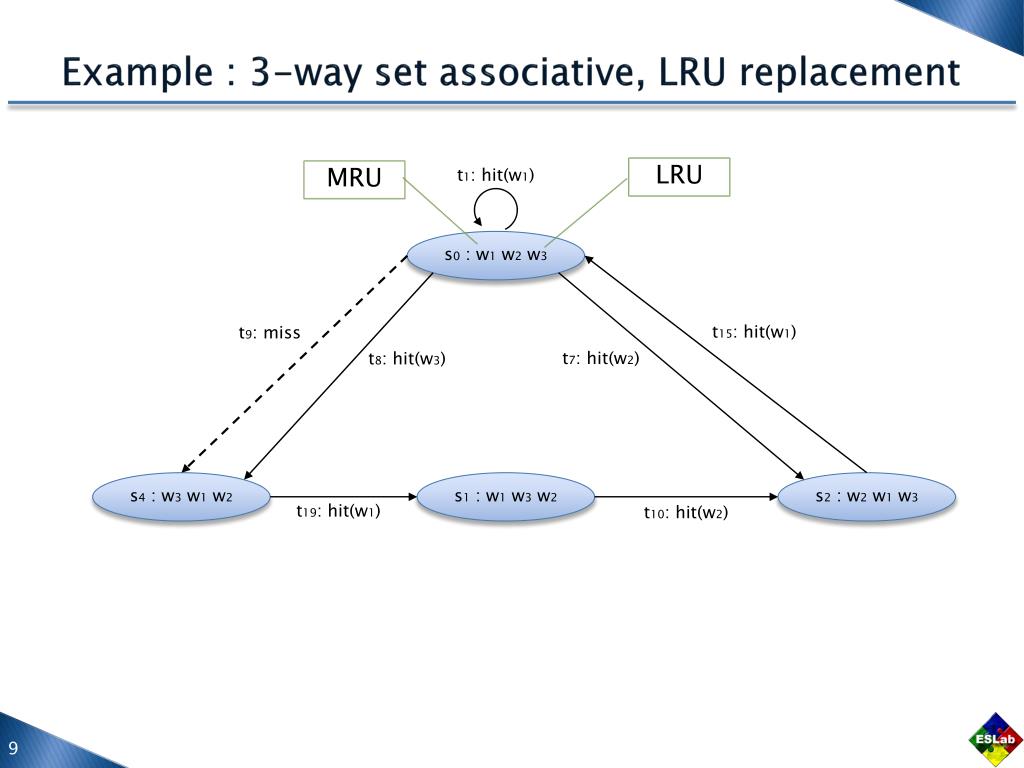 Replacement mechanism modeling • Input I • n address stored in the n ways of cache set • Initial state • Some address produce a cache miss for transfer new state • Output O • Checking hit or miss by the cache monitor • State S • Permutation of n way which way can be replaced • In an n-way set associative, each state has n+1 outgoing transitions • n transitions produce a hit • 1 transition produces a miss