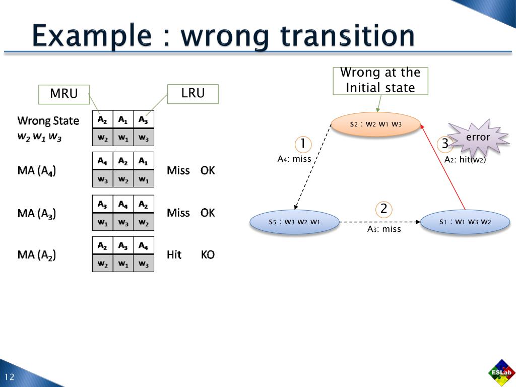 Example : wrong transition Wrong at the Initial state LRU MRU s2 : w2 w1 w3 error 1 3 A4: miss A2: hit(w2) 2 s1 : w1 w3 w2 s5 : w3 w2 w1 A3: miss