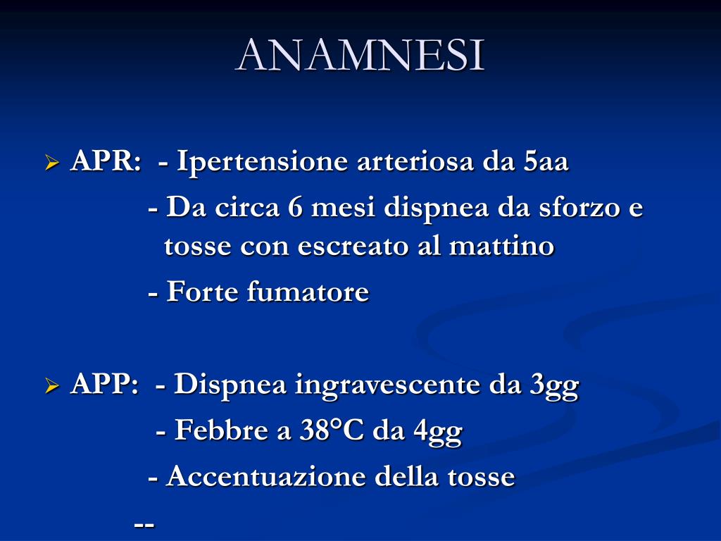 ANAMNESI • APR: - Ipertensione arteriosa da 5aa - Da circa 6 mesi dispnea da sforzo e tosse con escreato al mattino - Forte fumatore • APP: - Dispnea ingravescente da 3gg - Febbre a 38°C da 4gg - Accentuazione della tosse --