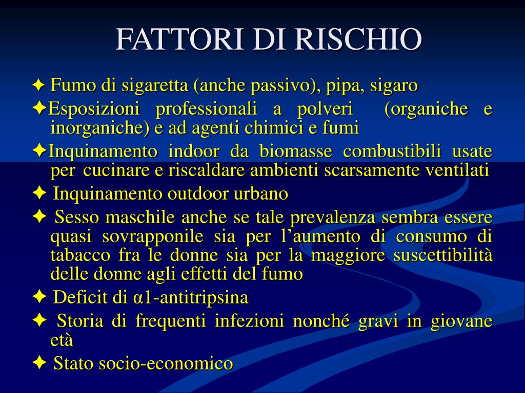 FATTORI DI RISCHIO Fumo di sigaretta (anche passivo), pipa, sigaro Esposizioni professionali a polveri (organiche e inorganiche) e ad agenti chimici e fumi Inquinamento indoor da biomasse combustibili usate per cucinare e riscaldare ambienti scarsamente ventilati Inquinamento outdoor urbano Sesso maschile anche se tale prevalenza sembra essere quasi sovrapponile sia per l’aumento di consumo di tabacco fra le donne sia per la maggiore suscettibilità delle donne agli effetti del fumo Deficit di α1-antitripsina Storia di frequenti infezioni nonché gravi in giovane età Stato socio-economico