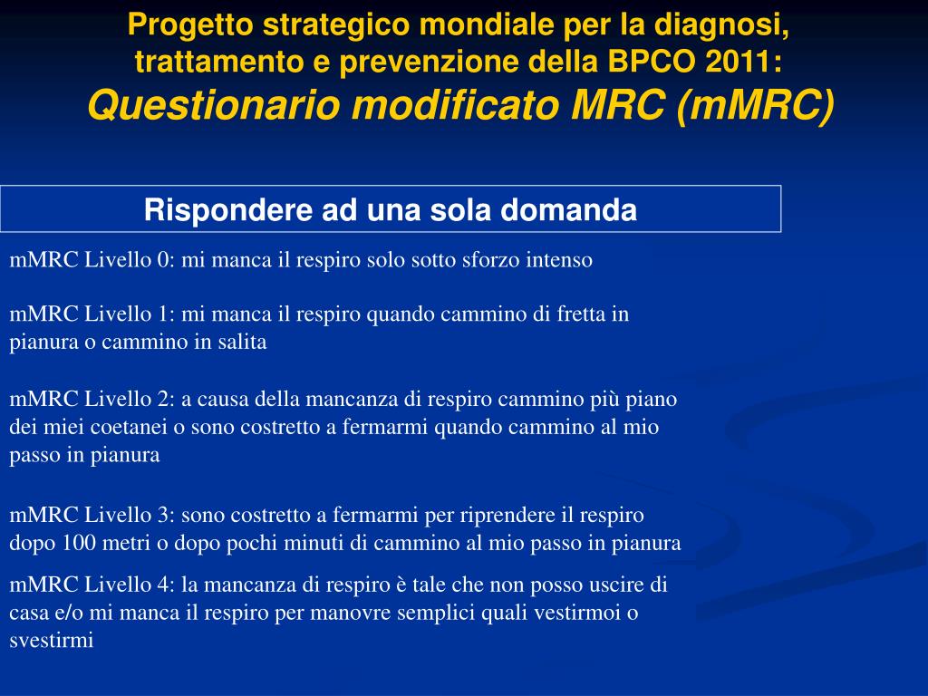 Progetto strategico mondiale per la diagnosi, trattamento e prevenzione della BPCO 2011: Questionario modificato MRC (mMRC) Rispondere ad una sola domanda mMRC Livello 0: mi manca il respiro solo sotto sforzo intenso mMRC Livello 1: mi manca il respiro quando cammino di fretta in pianura o cammino in salita mMRC Livello 2: a causa della mancanza di respiro cammino più piano dei miei coetanei o sono costretto a fermarmi quando cammino al mio passo in pianura mMRC Livello 3: sono costretto a fermarmi per riprendere il respiro dopo 100 metri o dopo pochi minuti di cammino al mio passo in pianura mMRC Livello 4: la mancanza di respiro è tale che non posso uscire di casa e/o mi manca il respiro per manovre semplici quali vestirmoi o svestirmi