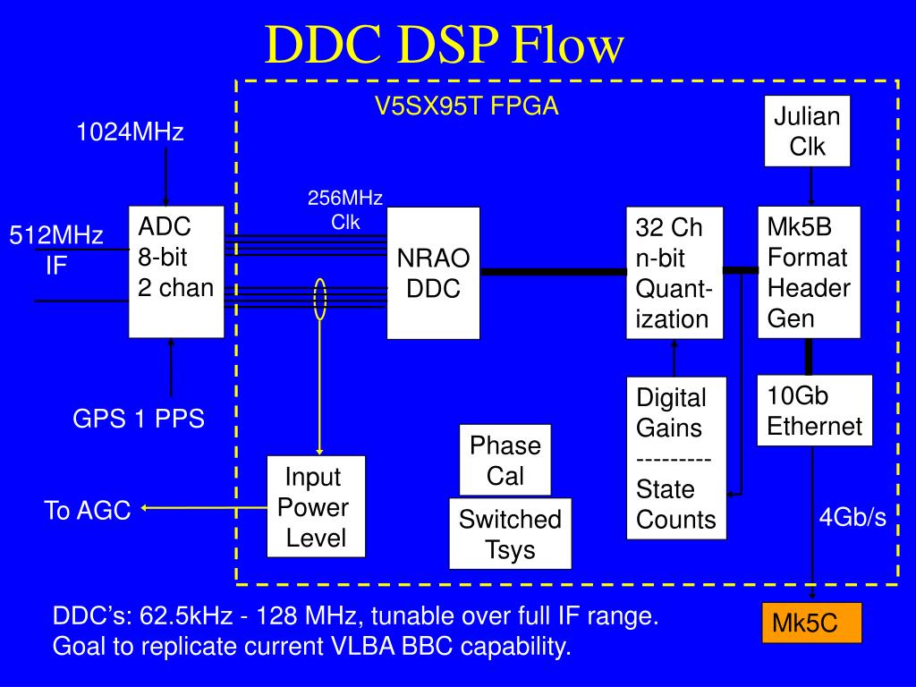 DDC DSP Flow V5SX95T FPGA Julian Clk 1024MHz 256MHz Clk ADC 8-bit 2 chan Mk5B Format Header Gen 32 Ch n-bit Quant- ization NRAO DDC 512MHz IF 10Gb Ethernet Digital Gains --------- State Counts GPS 1 PPS Phase Cal Input Power Level To AGC 4Gb/s Switched Tsys DDC’s: 62.5kHz - 128 MHz, tunable over full IF range. Goal to replicate current VLBA BBC capability. Mk5C