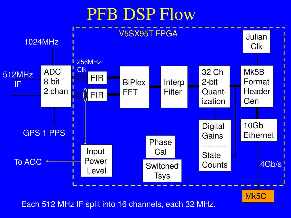 PFB DSP Flow V5SX95T FPGA Julian Clk 1024MHz 256MHz Clk ADC 8-bit 2 chan Mk5B Format Header Gen 32 Ch 2-bit Quant- ization Interp Filter BiPlex FFT 512MHz IF FIR FIR 10Gb Ethernet Digital Gains --------- State Counts GPS 1 PPS Phase Cal Input Power Level To AGC 4Gb/s Switched Tsys Mk5C Each 512 MHz IF split into 16 channels, each 32 MHz.
