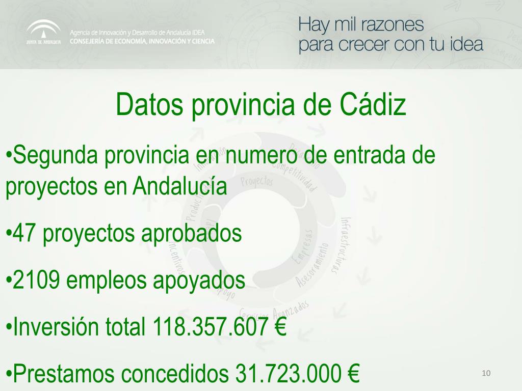 Datos provincia de Cádiz • Segunda provincia en numero de entrada de proyectos en Andalucía • 47 proyectos aprobados • 2109 empleos apoyados • Inversión total 118.357.607 € • Prestamos concedidos 31.723.000 € 10