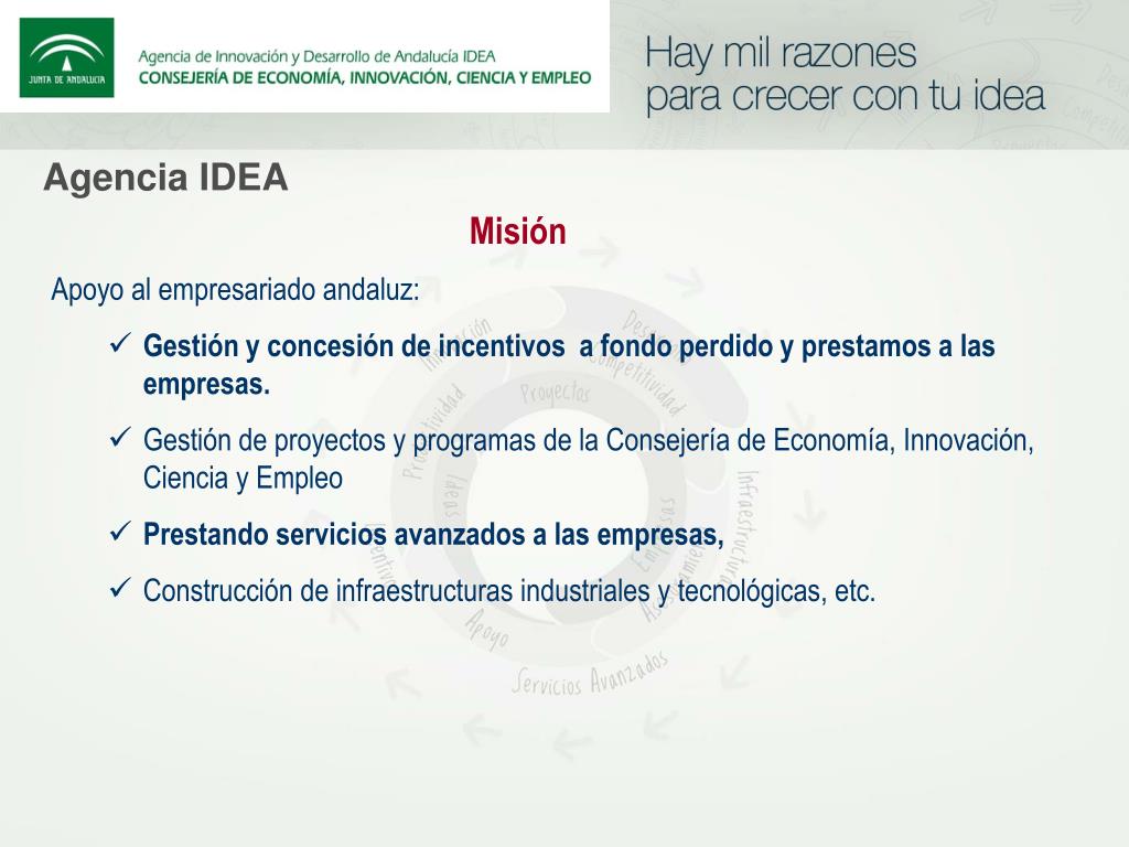 Agencia IDEA Misión • Apoyo al empresariado andaluz: • Gestión y concesión de incentivos a fondo perdido y prestamos a las empresas. • Gestión de proyectos y programas de la Consejería de Economía, Innovación, Ciencia y Empleo • Prestando servicios avanzados a las empresas, • Construcción de infraestructuras industriales y tecnológicas, etc.