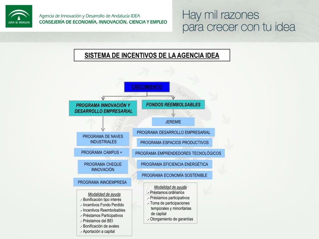 SISTEMA DE INCENTIVOS DE LA AGENCIA IDEA CRECIMIENTO FONDOS REEMBOLSABLES PROGRAMA INNOVACIÓN Y DESARROLLO EMPRESARIAL JEREMIE PROGRAMA DESARROLLO EMPRESARIAL PROGRAMA DE NAVES INDUSTRIALES PROGRAMA ESPACIOS PRODUCTIVOS PROGRAMA CAMPUS + PROGRAMA EMPRENDEDORES TECNOLÓGICOS PROGRAMA CHEQUE INNOVACIÓN PROGRAMA EFICIENCIA ENERGÉTICA PROGRAMA ECONOMÍA SOSTENIBLE PROGRAMA INNOEMPRESA Modalidad de ayuda .- Préstamos ordinarios .- Préstamos participativos .- Toma de participaciones temporales y minoritarias de capital .- Otorgamiento de garantías Modalidad de ayuda .- Bonificación tipo interés .- Incentivos Fondo Perdido .- Incentivos Reembolsables .- Préstamos Participativos .- Préstamos del BEI .- Bonificación de avales .- Aportación a capital