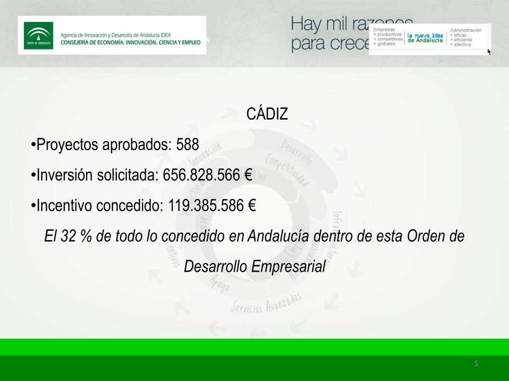 CÁDIZ • Proyectos aprobados: 588 • Inversión solicitada: 656.828.566 € • Incentivo concedido: 119.385.586 € • El 32 % de todo lo concedido en Andalucía dentro de esta Orden de • Desarrollo Empresarial