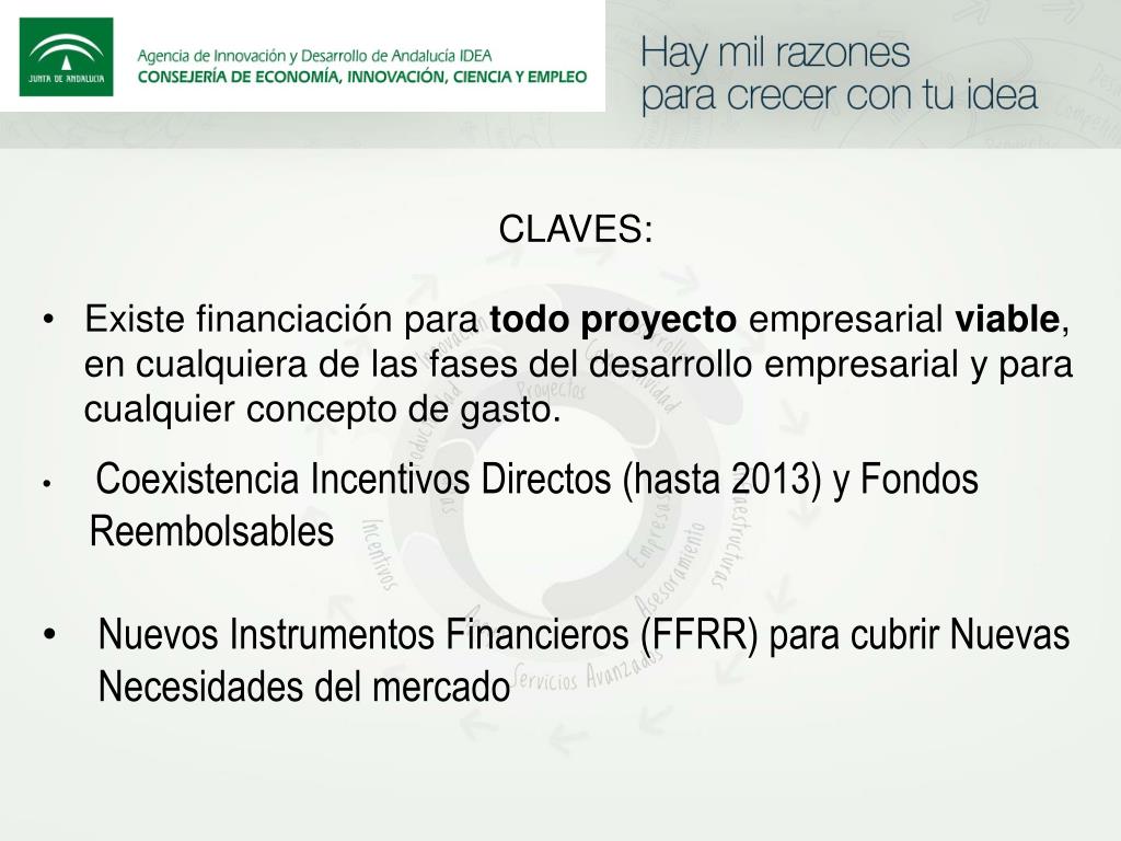 CLAVES: • Existe financiación para todo proyecto empresarial viable, en cualquiera de las fases del desarrollo empresarial y para cualquier concepto de gasto. • Coexistencia Incentivos Directos (hasta 2013) y Fondos Reembolsables • Nuevos Instrumentos Financieros (FFRR) para cubrir Nuevas Necesidades del mercado