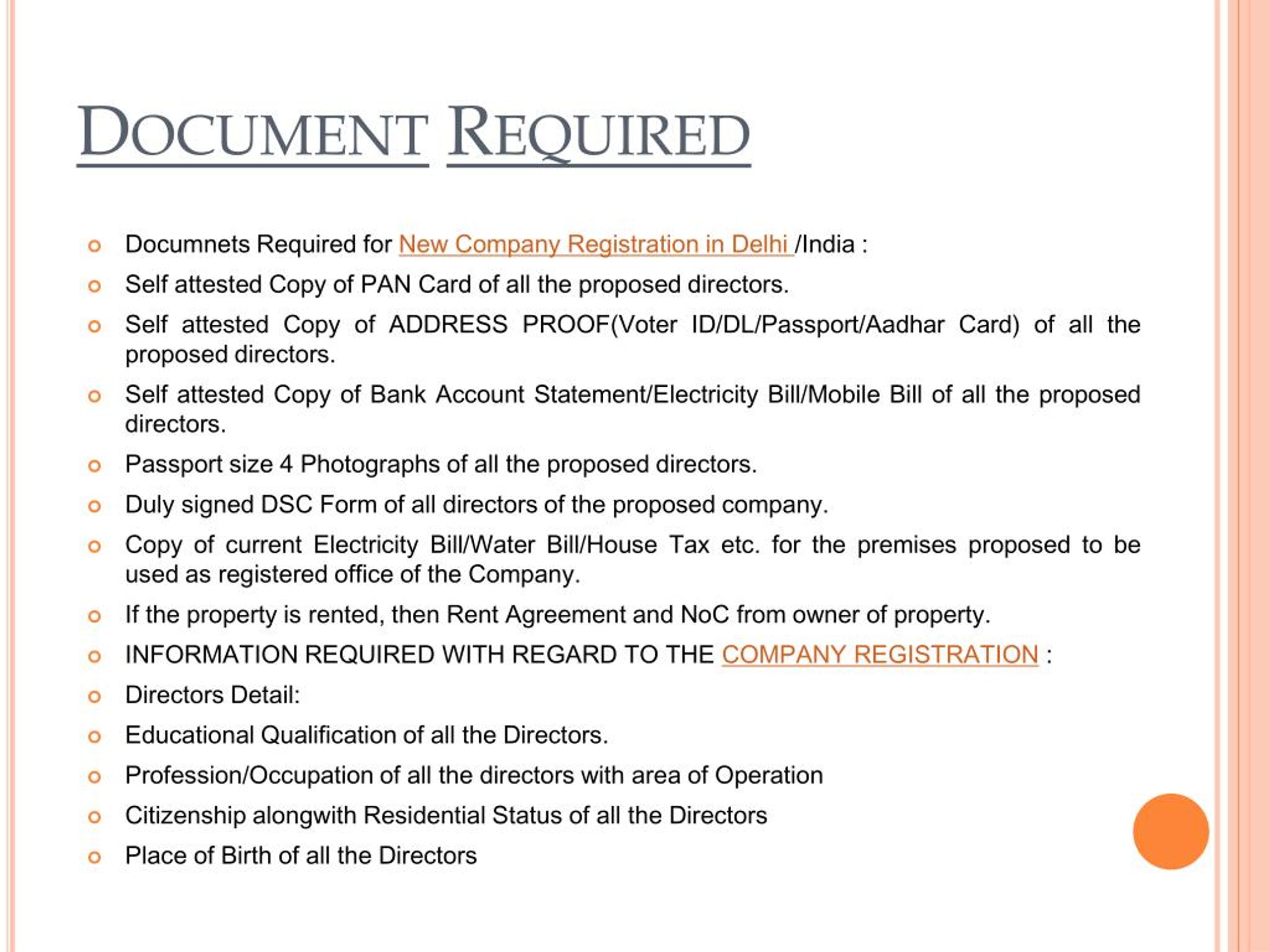 DocumentRequired • Documnets Required for New Company Registration in Delhi /India : • Self attested Copy of PAN Card of all the proposed directors. • Self attested Copy of ADDRESS PROOF(Voter ID/DL/Passport/Aadhar Card) of all the proposed directors. • Self attested Copy of Bank Account Statement/Electricity Bill/Mobile Bill of all the proposed directors. • Passport size 4 Photographs of all the proposed directors. • Duly signed DSC Form of all directors of the proposed company. • Copy of current Electricity Bill/Water Bill/House Tax etc. for the premises proposed to be used as registered office of the Company. • If the property is rented, then Rent Agreement and NoC from owner of property. • INFORMATION REQUIRED WITH REGARD TO THE COMPANY REGISTRATION : • Directors Detail: • Educational Qualification of all the Directors. • Profession/Occupation of all the directors with area of Operation • Citizenship alongwith Residential Status of all the Directors • Place of Birth of all the Directors